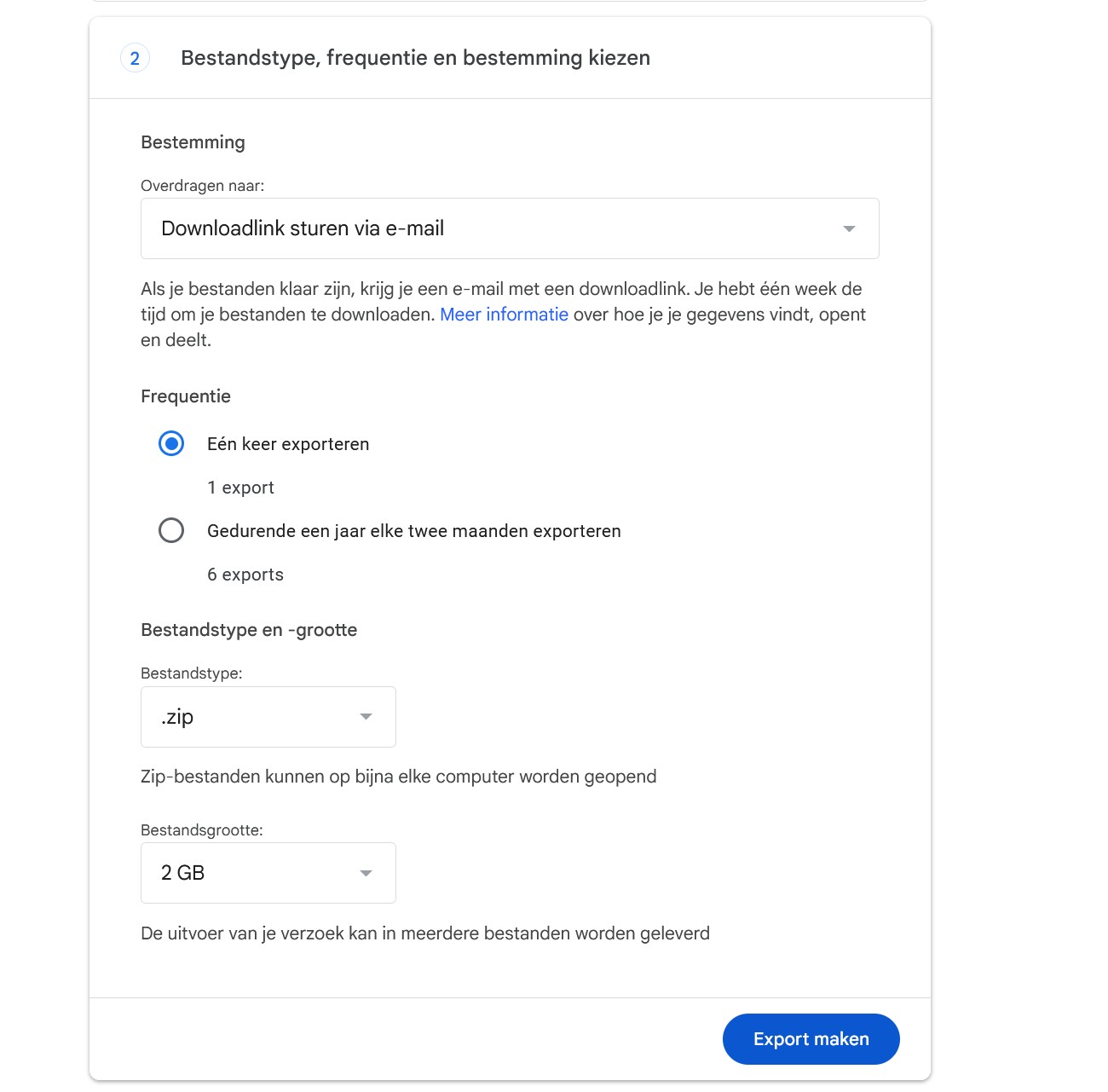Next, you set what the export should look like: do you want to receive a folder by email or transfer it to another cloud service (Dropbox, OneDrive), and do you want to make a one-time or regular backup? Completing the export can take anywhere from a few hours to even days, depending on your settings.