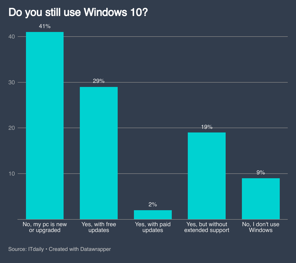 19 percent continue using Windows 10 without any form of support. However, this isn’t without security risks, as you won’t receive patches for newly discovered vulnerabilities in Windows, which appear regularly.