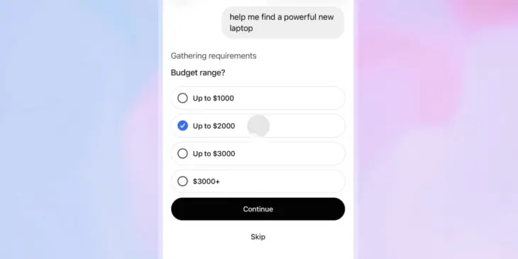 The function appears automatically when ChatGPT detects a shopping query. Users can also manually select the tool through the tool menu. This opens a visual interface where they can input preferences such as budget, target audience, and desired features.