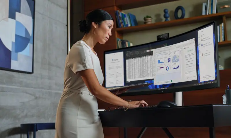 HP also builds in a 5 MP webcam, along with several speakers. Also interesting is the Virtual Multiple Display mode where you can split the screen into three workspaces to organize applications more efficiently. HP is not new to ultra-wide screens: this HP Series 5 Pro 49 Conferencing Monitor is a big brother to the previously launched HP E45c G5 that we already reviewed.