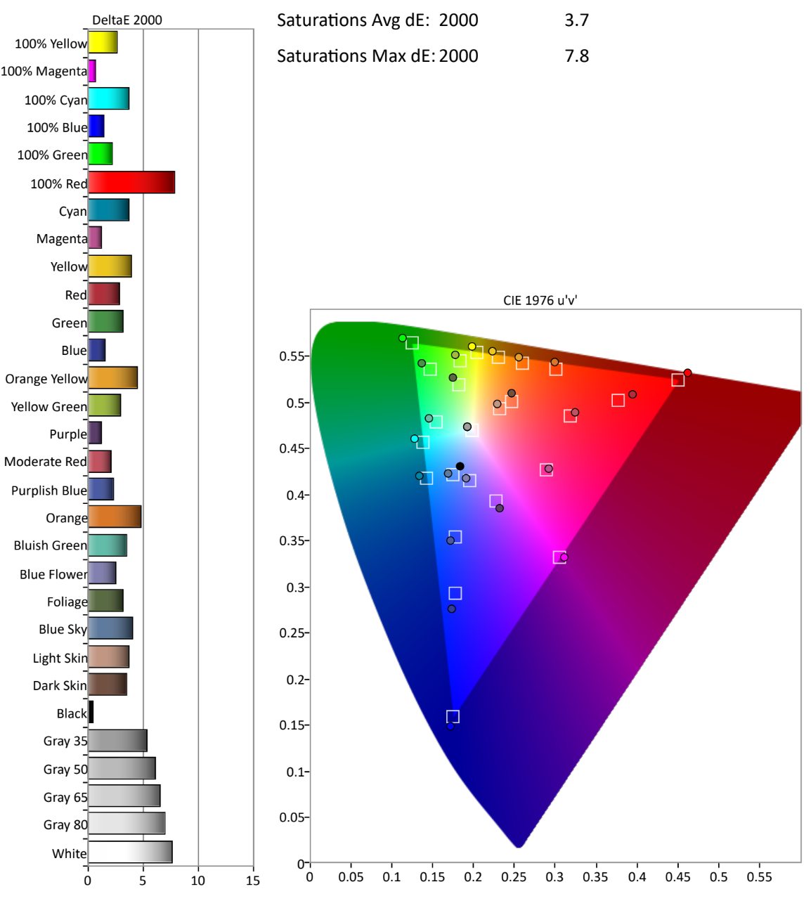 That may be so, but the calibration process is still open for improvement. We measure both a deviant white balance and an incorrect color adjustment. A DeltaE of less than two is considered ideal for graphic professionals. Here we measure an average deviation of 3.7 with an outlier of DeltaE 7.8 for red colors.